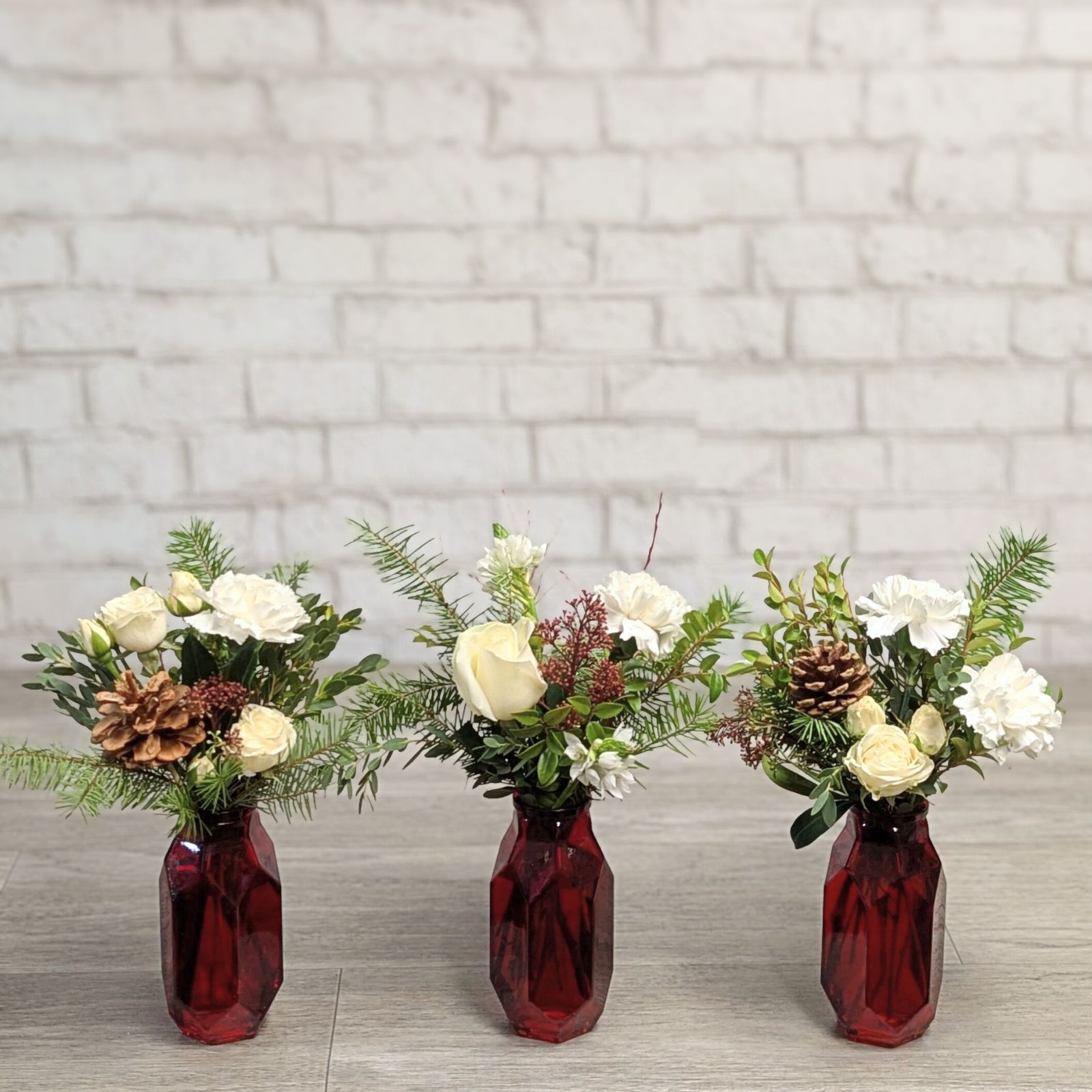This curated collection features a trio of petite holiday arrangements.  Perfect for decorating small spaces, accenting a mantelpiece, or gracing a festive table setting.  Each arrangement in the trio offers a distinct yet harmonious blend of holiday blooms, lush evergreens, and festive accents, ensuring a cohesive and luxurious look throughout your home.