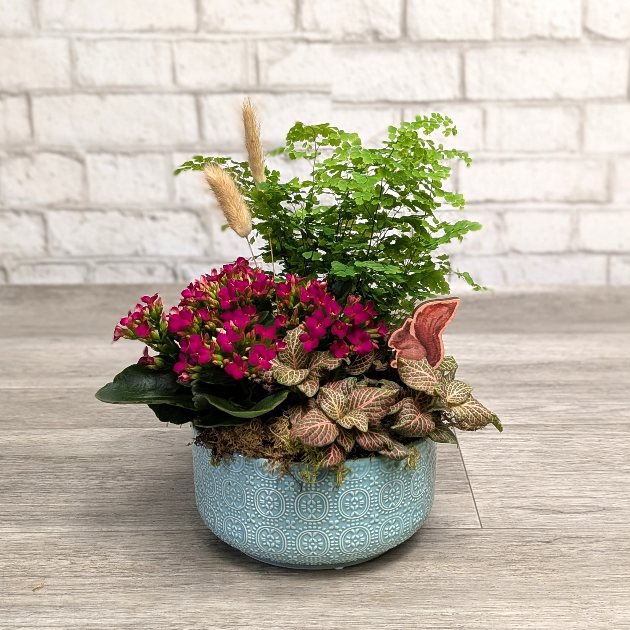 A modest indoor garden of assorted tropical plants adorned with a blooming plant and seasonal spring touches.