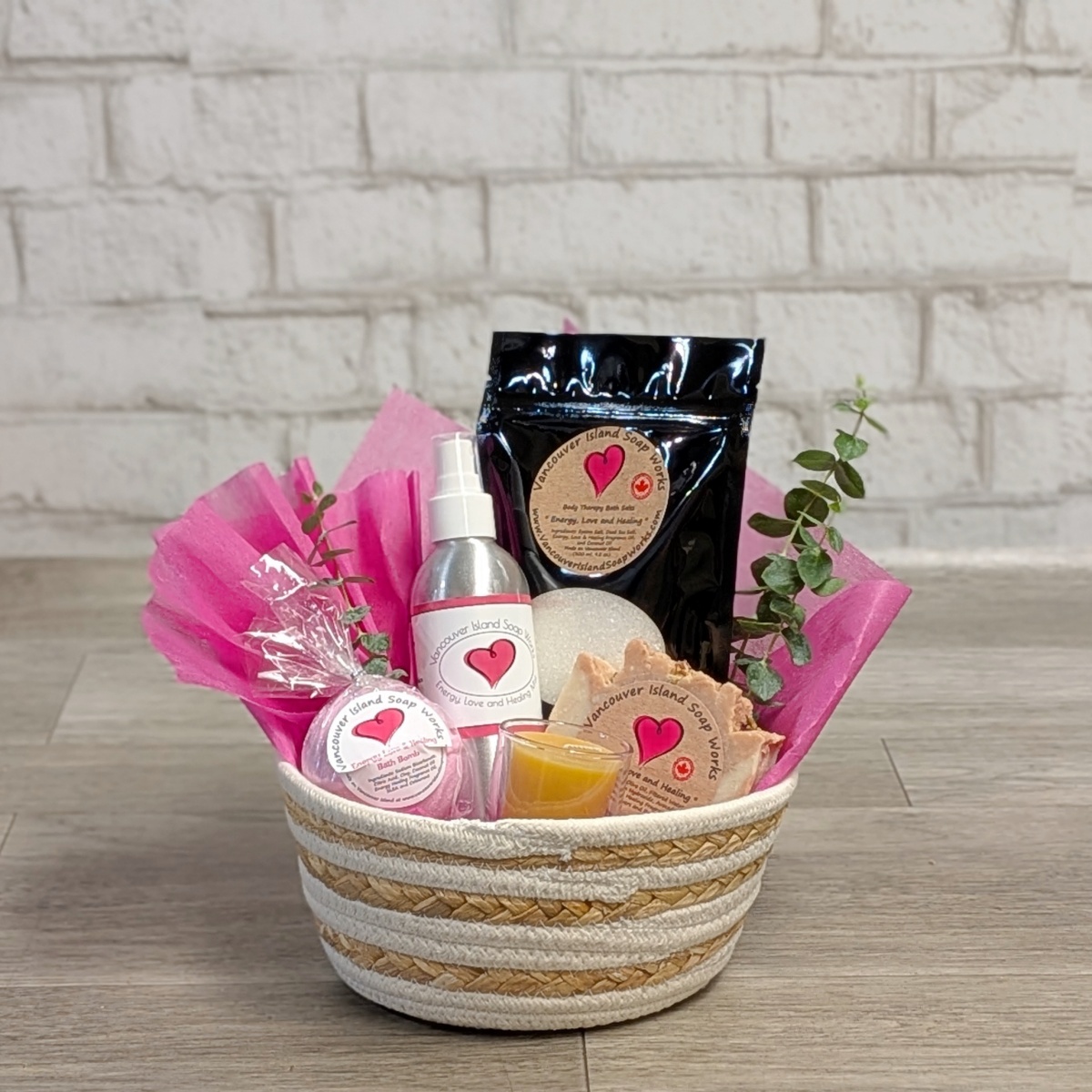 This wonderful spa selection of Vancouver Island Soapworks amazing rejuvenating scent of Energy, Love and Healing bath salts with the matching soap, a bath bomb fizz and a lovely Energy Mist spray. Now to add to the ambience we have included a votive candle in a holder from Honey Candles – all put together in a reusable cotton basket.