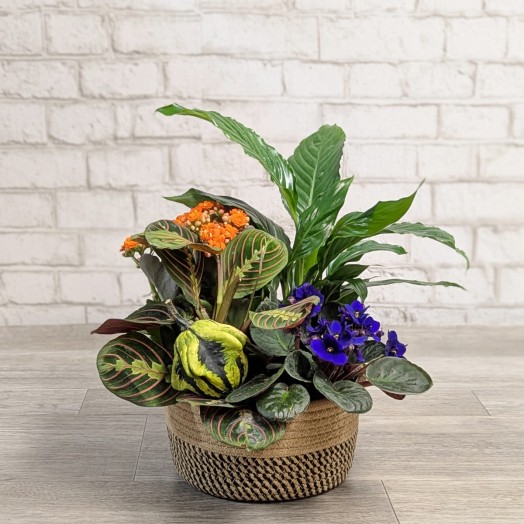 A delightful mix of indoor tropical and blooming plants adorned with seasonal autumnal touches and comes displayed in a basket.