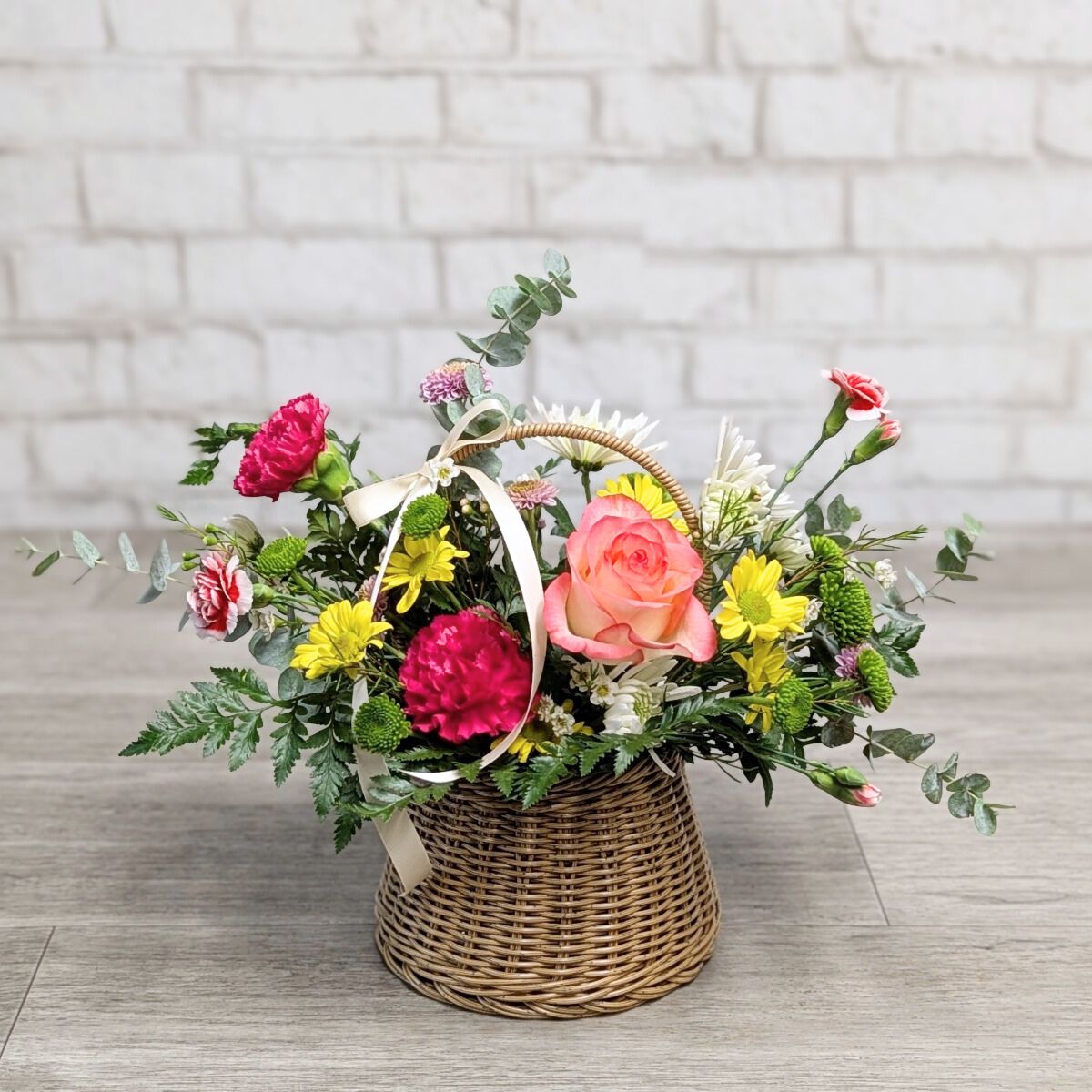 This charming basket brings a dazzling array of brightly coloured mums with the delicate elegance of a focal rose.  Finished with seasonal blooms and accents this arrangement is sure to guarantee a smile to anyone’s face.