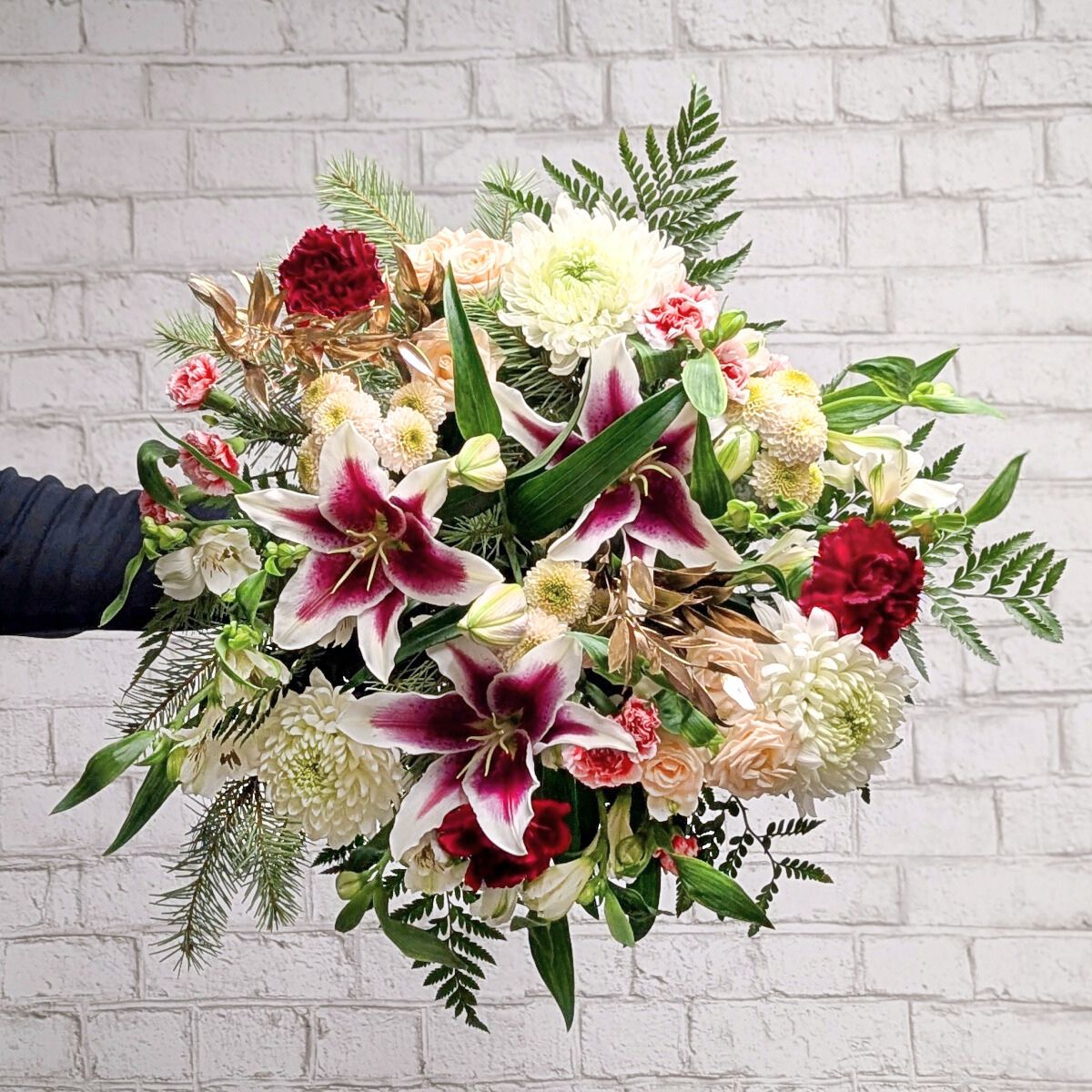This hand-tied bouquet of pretty pink, white and burgundy blooms come adorned with fragrant lilies, evergreen and touches of gold.