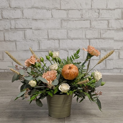 A delightfully compact arrangement of soft autumnal blooms and a mini pumpkin pick, the perfect touch of fall to spice up any home. This design is front facing.  Container may vary.