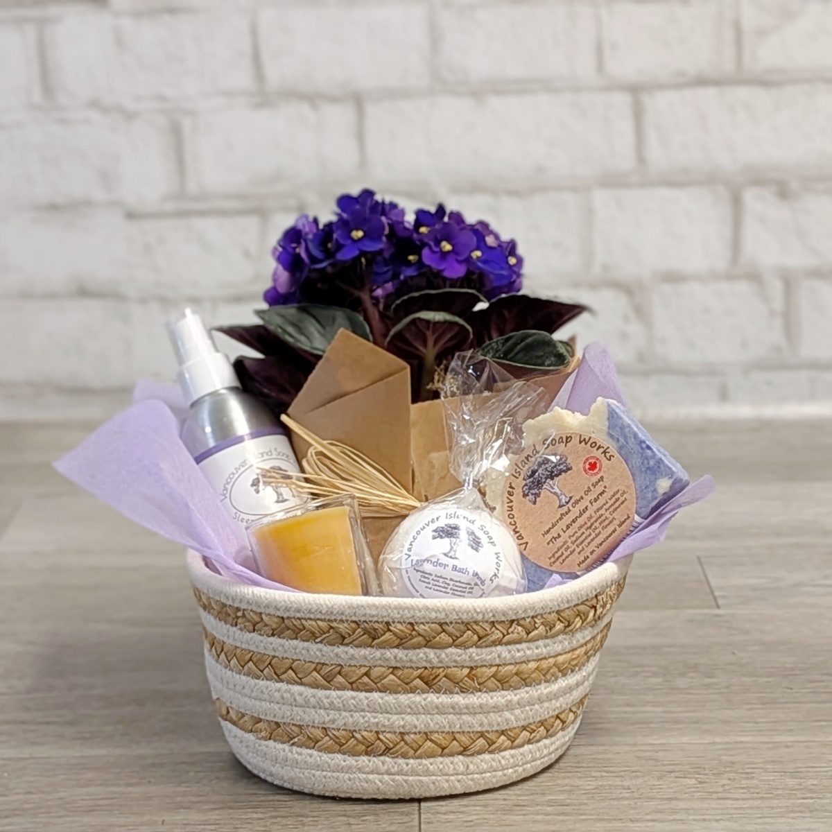 The perfect gift to pamper the one you love with Vancouver Island Soapworks amazing Sleepytime Lavender Mist , a bar  of Lavender Farm Soap, a Lavender bath fizz, along with a votive from Honey Candles in a glass holder, packaged in a reusable rope and wicker basket and finished with a 4″ blooming plant (colour of plant may vary