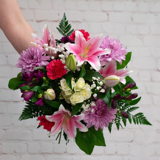 Beautiful local flowers and lush foliage capture the enchantment of a rain-kissed garden. This enduring hand-tied bouquet is a delightful gift to cherish life’s ever-changing melodies.